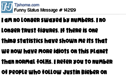 X says I am no longer swayed by numbers. I no longer trust figures. If there is one thing statistics have shown me its that we now have more idiots on this planet than normal folks. I refer you to number of people who follow Justin Bieber on twitter.