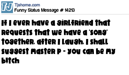 X If I ever have a girlfriend that requests that we have a 'song' together, after I laugh, I shall suggest master p - you can be my b!tch