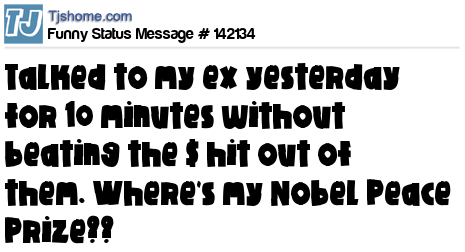 X Talked to my ex yesterday for 10 minutes without beating the $ hit out of them. Where's my Nobel Peace Prize??