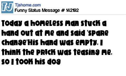 X says Today a homeless man stuck a hand out at me and said 'spare change'His hand was empty, I think the pr!ck was teasing me, so I took his dog