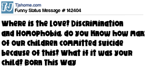 X says Where is the Love? Discrimination and Homophobia, do you know how many of our children committed suicide because of this? What if it was your child? Born This Way
