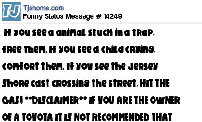 - # 14245 If you see a animal stuck in a trap, free them. If you see a child crying, comfort them. If you see the Jersey Shore cast crossing the street, HIT THE GAS!