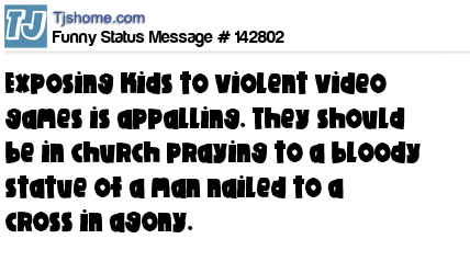 X says Exposing kids to violent video games is appalling. They should be in church praying to a bloody statue of a man nailed to a cross in agony.