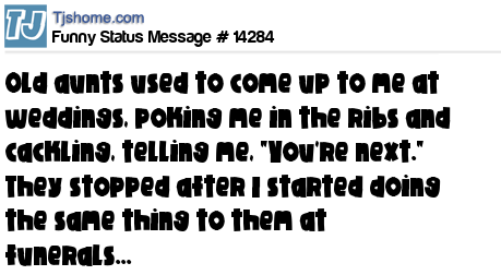 - # 56803 Old aunts used to come up to me at weddings, poke me in the ribs and cackle, telling me, "You're next." They stopped after I started doing the same thing to them at funerals.