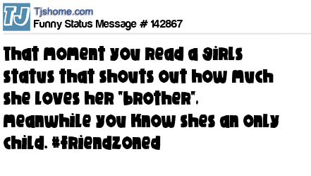 X That moment you read a girls status that shouts out how much she loves her "brother", meanwhile you know shes an only child. #friendzoned