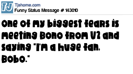 X says One of my biggest fears is meeting Bono from U2 and saying "I'm a huge fan, Bobo."