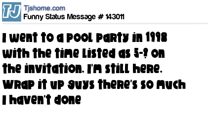 X says I went to a pool party in 1998 with the time listed as 5-? on the invitation. I'm still here. Wrap it up guys there's so much I haven't done