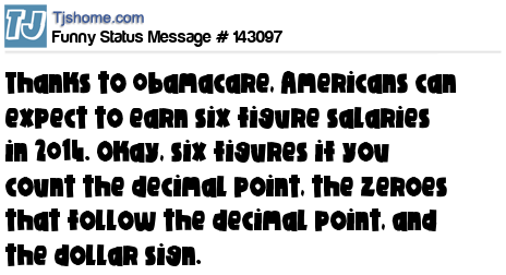 X Thanks to 0bamacare, Americans can expect to earn six figure salaries in 2014. Okay, six figures if you count the decimal point, the zeroes that follow the decimal point, and the dollar sign.