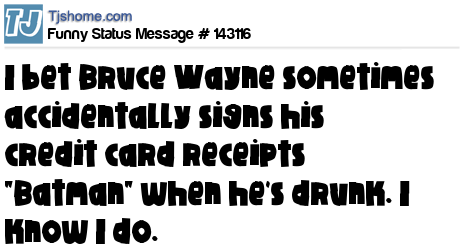 X I bet Bruce Wayne sometimes accidentally signs his credit card receipts "Batman" when he's drunk. I know I do.