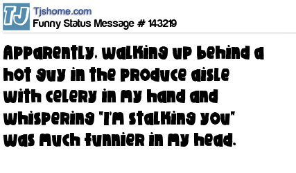 X says Apparently, walking up behind a hot guy in the produce aisle with celery in my hand and whispering "I'm stalking you" was much funnier in my head.