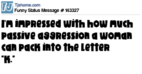 X says I'm impressed with how much passive aggression a woman can pack into the letter "k."