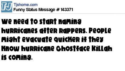 X says We need to start naming hurricanes after rappers. People might evacuate quicker if they know hurricane Ghostface Killah is coming.