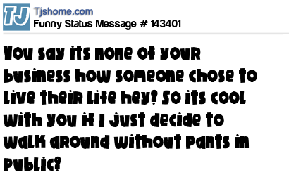 X says You say its none of your business how someone chose to live their life hey? So its cool with you if I just decide to walk around without pants in public?