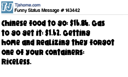 - # 153177 Chinese food to go: $17.95. Gas to go get it $1.50. Getting home and realizing they forgot one of your containers: Riceless.