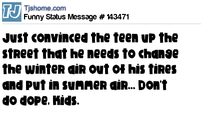 X  Just convinced the teen up the street that he needs to change the winter air out of his tires and put in summer air... Don't do dope, kids.