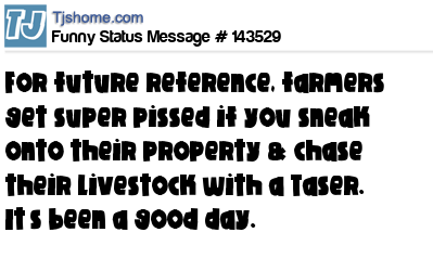 X says For future reference, farmers get super pissed if you sneak onto their property & chase their livestock with a Taser. It’s been a good day.