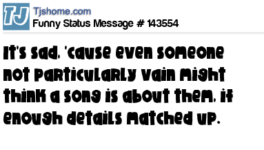 - # 84929 I need to stop reading into things like the song "You're So Vain", probably isn't about me and just becuase she thinks you're funny doesn't mean anything but that.