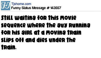X says Still waiting for this movie sequence where the guy running for his girl at a moving train slips off and dies under the train.