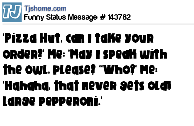X says 'Pizza Hut, can I take your order?' Me: 'May I speak with the owl, please? ''Who?' Me: 'Hahaha, that never gets old! Large pepperoni.'