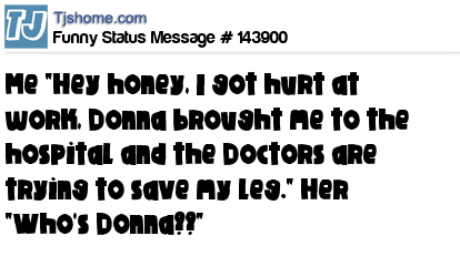 X Me "Hey honey, I got hurt at work, Donna brought me to the hospital and the Doctors are trying to save my leg." Her "Who's Donna??"