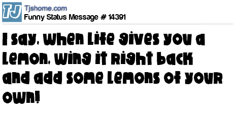 - # 7487 Sometimes when life hands you lemons you just need to take those lemons and throw them back in life's face and say "How dare you!!! Don't come back here till you have some oranges or at least a pretty good sized grapefruit!"