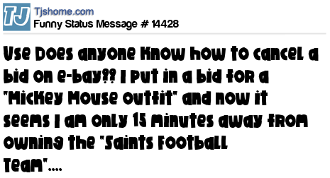 - # 175947 Does anyone know how to cancel a bid on eBay? I just bid on a Mickey Mouse Outfit and now I'm 10 minutes away from owning the Dallas Cowboys.