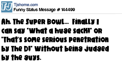 - # 144501 X says Ah, The Super Bowl... Finally I can say "What a huge sack!" or "That's some serious penetration by The D!" -he got it from twittterr