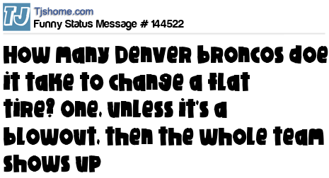 X says How many Denver broncos does it take to change a flat tire? One, unless it's a blowout, then the whole team shows up