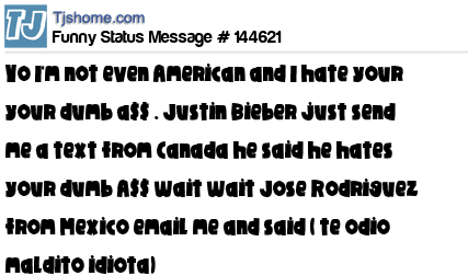 X says Yo I'm not even American and I hate your your dumb a$$ . Justin Bieber just send me a text from Canada he said he hates your dumb A$$ wait wait Jose Rodriguez from Mexico email me and said ( te odio maldito idiota)