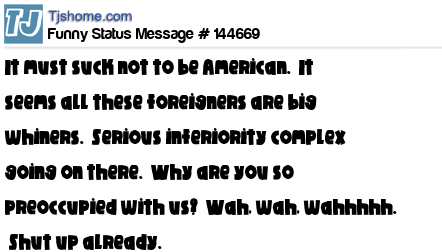 X says It must suck not to be American. It seems all these foreigners are big whiners. Serious inferiority complex going on there. Why are you so preoccupied with us? Wah, wah, wahhhhh. Shut up already.