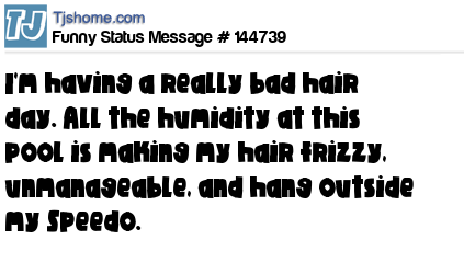 X says I'm having a really bad hair day. All the humidity at this pool is making my hair frizzy, unmanageable, and hang outside my Speedo.
