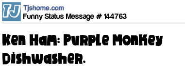X says Ken Ham: Purple Monkey Dishwasher.