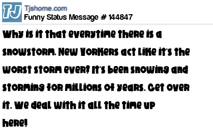 X says Why is it that everytime there is a snowstorm, New Yorkers act like it's the worst storm ever? It's been snowing and storming for millions of years. Get over it. We deal with it all the time up here!