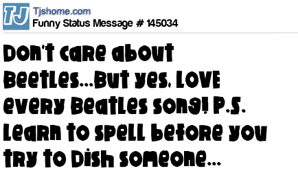 X Don't care about Beetles...But yes, LOVE every Beatles song! P.S. learn to spell before you try to Dish someone...