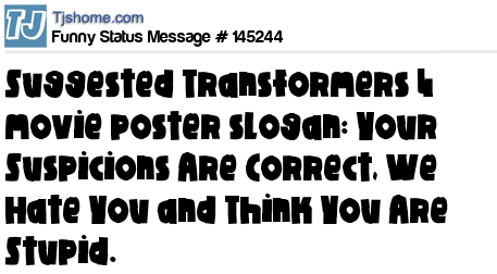 X says Suggested Transformers 4 movie poster slogan: Your Suspicions Are Correct, We Hate You and Think You Are Stupid.