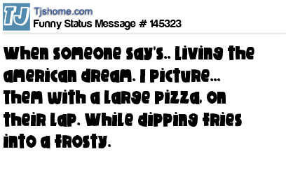 X says When someone say's.. Living the american dream. I picture... Them with a large pizza, on their lap. While dipping fries into a frosty.