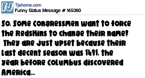 X So, Some Congressmen want to force the Redskins to change their name? They are just upset because their last decent season was 1491, the year before Columbus discovered America...