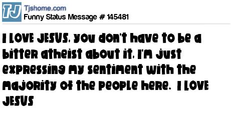 X says I LOVE JESUS, you don't have to be a bitter atheist about it, I'm just expressing my sentiment with the majority of the people here.  I LOVE JESUS