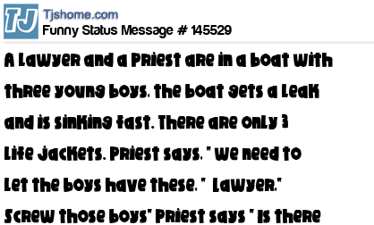 X says A lawyer and a Priest are in a boat with three young boys, the boat gets a leak and is sinking fast. There are only 3 life jackets. Priest says, " we need to let the boys have these, " Lawyer," Screw those boys" Priest says " Is there time for that?"