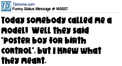 X says Today somebody called me a model! Well they said "poster boy for birth control", but I knew what they meant.