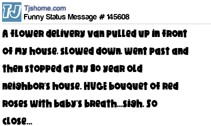 X says A flower delivery van pulled up in front of my house, slowed down, went past and then stopped at my 80 year old neighbor's house. HUGE bouquet of red roses with baby's breath...sigh. So close...