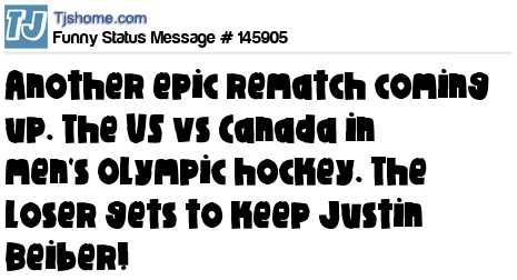 X Another epic rematch coming up. The US vs Canada in men's Olympic hockey. The loser gets to keep Justin Beiber!