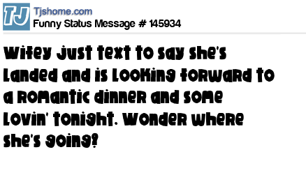 X says Wifey just text to say she's landed and is looking forward to a romantic dinner and some lovin' tonight. Wonder where she's going?