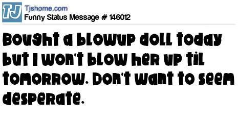 X says Bought a blowup doll today but I won't blow her up til tomorrow. Don't want to seem desperate.