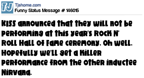 X says KISS announced that they will not be performing at this year's Rock N' Roll Hall of Fame ceremony. Oh well. Hopefully we'll get a killer performance from the other inductee Nirvana.