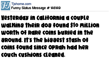 X says Yesterday in California a couple walking their dog found $10 million worth of rare coins buried in the ground. It's the biggest stash of coins found since Oprah had her couch cushions cleaned.