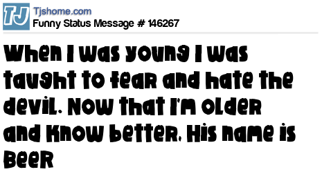 - # 145342 When I was young I was taught to fear and hate the devil. Now that I'm older and know better, I'd like to get high and have a beer with him.