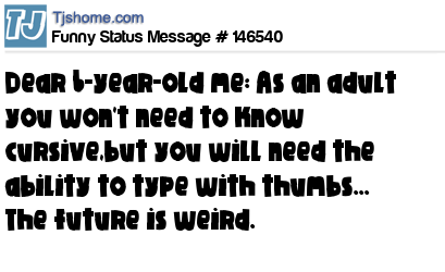 X Dear 6-year-old me: As an adult you won't need to know cursive,but you will need the ability to type with thumbs... The future is weird.