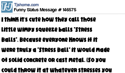 X I think it's cute how they call those little wimpy squeeze balls "Stress Balls". Because everyone knows if it were truly a "Stress Ball" it would made of solid concrete or cast metal. (So you could throw it at whatever stresses you out)