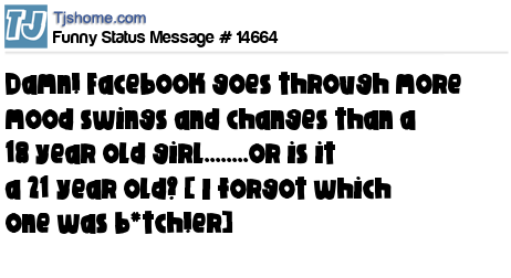 X says Damn! Facebook goes through more mood swings and changes than a 18 year old girl........or is it a 21 year old? [ I forgot which one was b*tch!er]